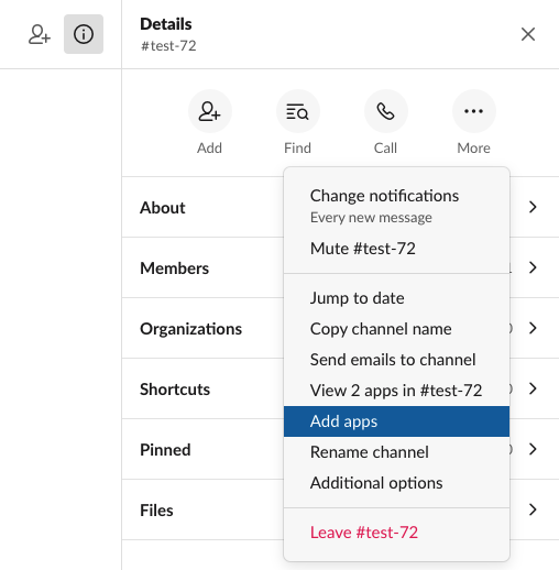 7. Now go to your slack instance. For any public channel go to info => more => add apps. In the search bar search for the name of your app. (If using the desktop version of slack, you may need to restart Slack for it to pick up the new app). Airbyte will only replicate messages from channels that the Slack bot has been added to.